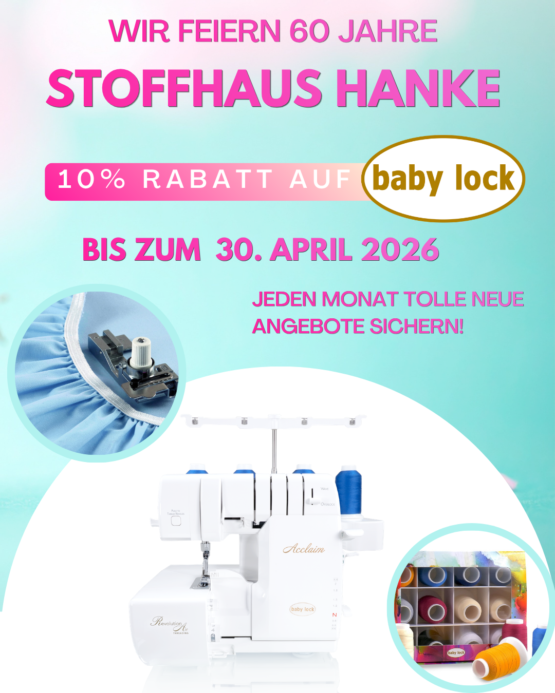 Sind Sie bereit, Ihre Nähprojekte auf das nächste Level zu heben? Träumen Sie von perfekten, sauberen und professionellen Nähten, die aussehen wie vom Designer? Dann ist es Zeit für ein Upgrade! Wir präsentieren stolz die baby lock Acclaim – die Overlock-Maschine, die maximale Leistung mit kinderleichter Bedienung vereint und puren Nähspaß verspricht.